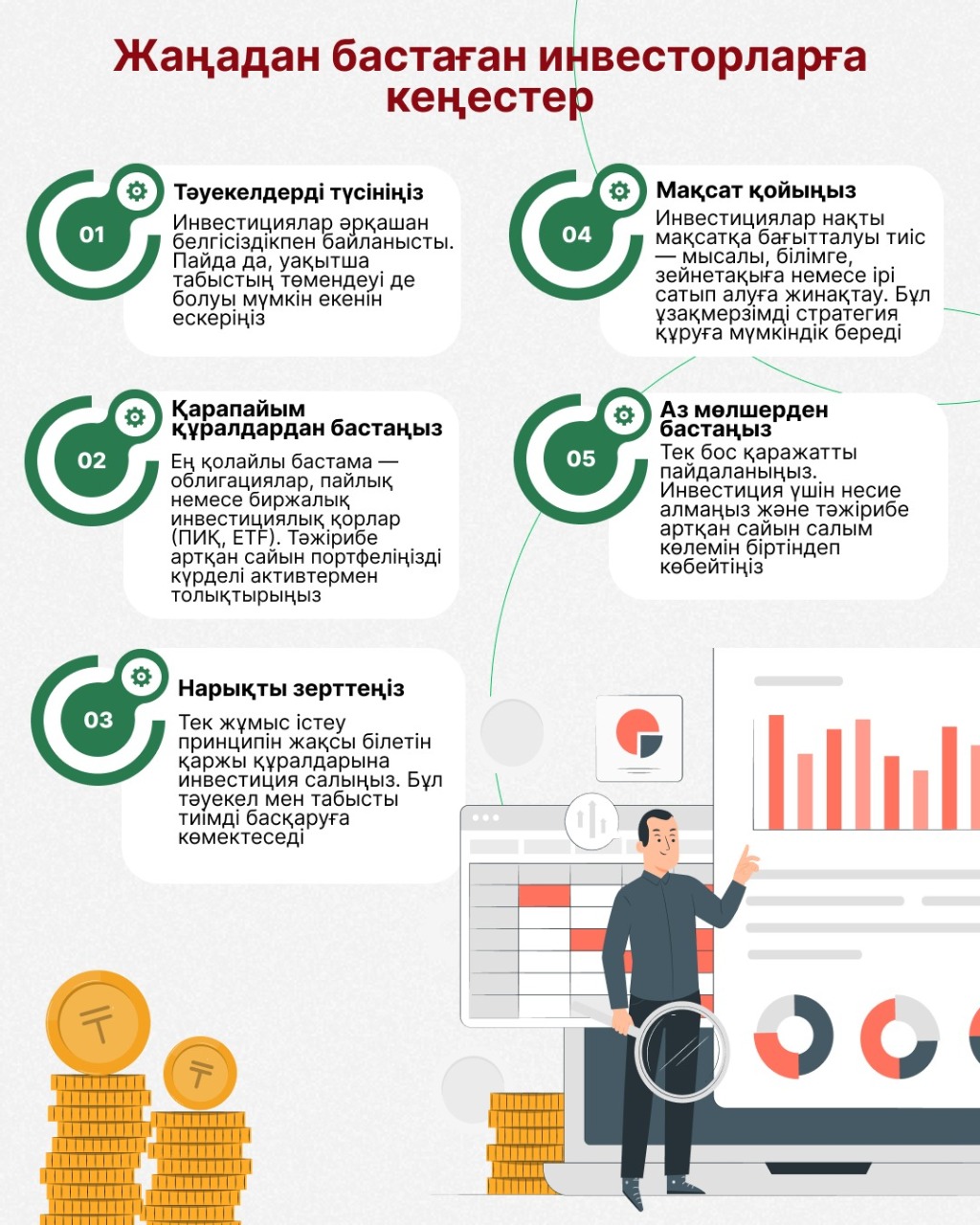 Бұл ретте, инвестициялар саналы көзқарасты, базалық білімді және ықтимал тәуекелдерді түсінуді қажет ететінін білу маңызды. Қор нарығы — тез байып кетудің жолы емес, ол жеке қаржыны басқарудың ұзақ мерзімді құралы.