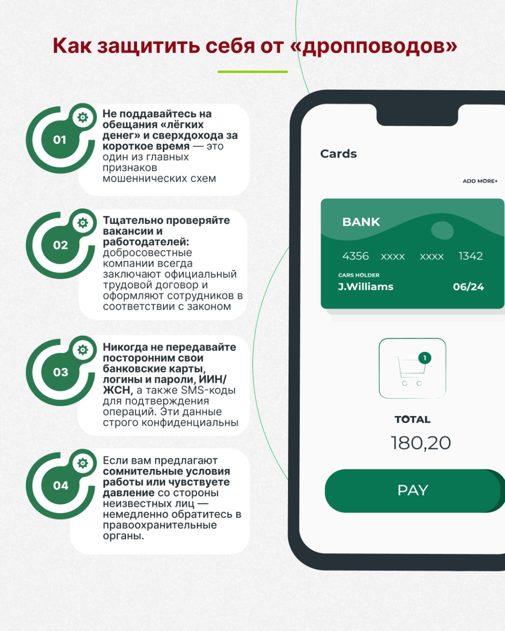 никогда не передавайте свою банковскую карту, реквизиты или доступ к онлайн-банкингу третьим лицам;